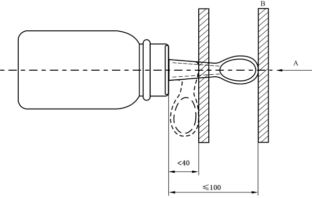 試樣的主軸與拋光鋼板垂直。在試驗(yàn)開始時(shí),奶嘴或飲用部件允許偏離主軸為 5°。以10±2mm/min 的速度施加10±1N的力到100 mm×100 mm 的拋光鋼板上。測量從鎖緊環(huán)到奶嘴或飲用部件彎曲點(diǎn)的距離。如果沒有鎖緊環(huán),則測量奶瓶瓶身瓶口到奶嘴或飲用部件彎曲點(diǎn)的距離。