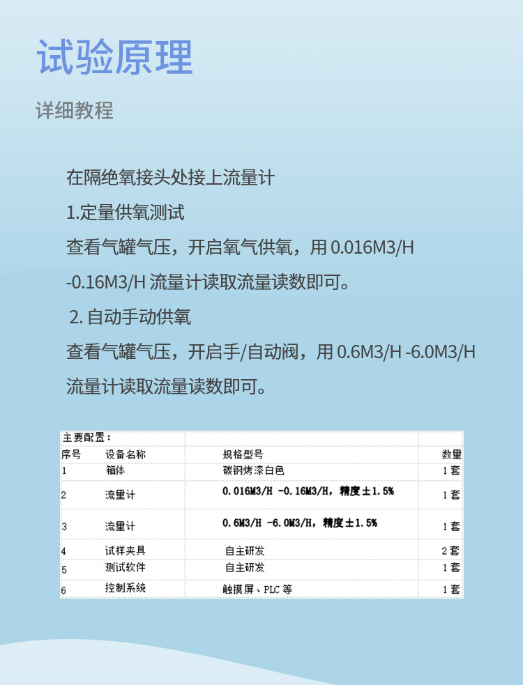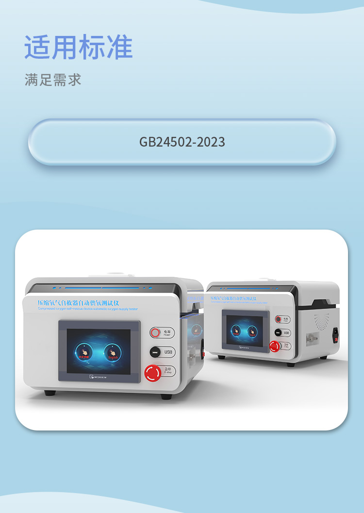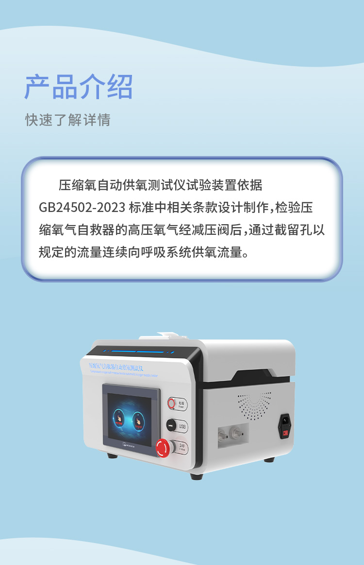 壓縮氧自動(dòng)供氧測(cè)試儀試驗(yàn)裝置依據(jù) GB24502-2023 標(biāo)準(zhǔn)中相關(guān)條款設(shè)計(jì)制作,檢驗(yàn)壓縮氧